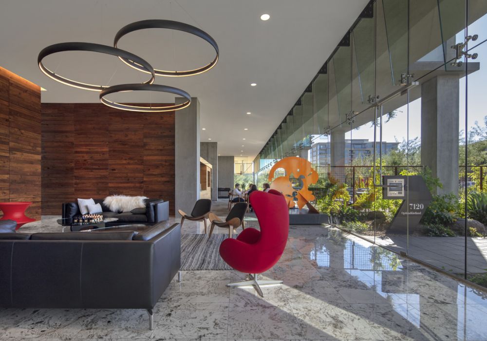 In the lobby at 7120 Optima Kierland® bright accents with the Egg chair and David Hovey “Duo” Sculpture add vitality and energy to this light-filled public space.
